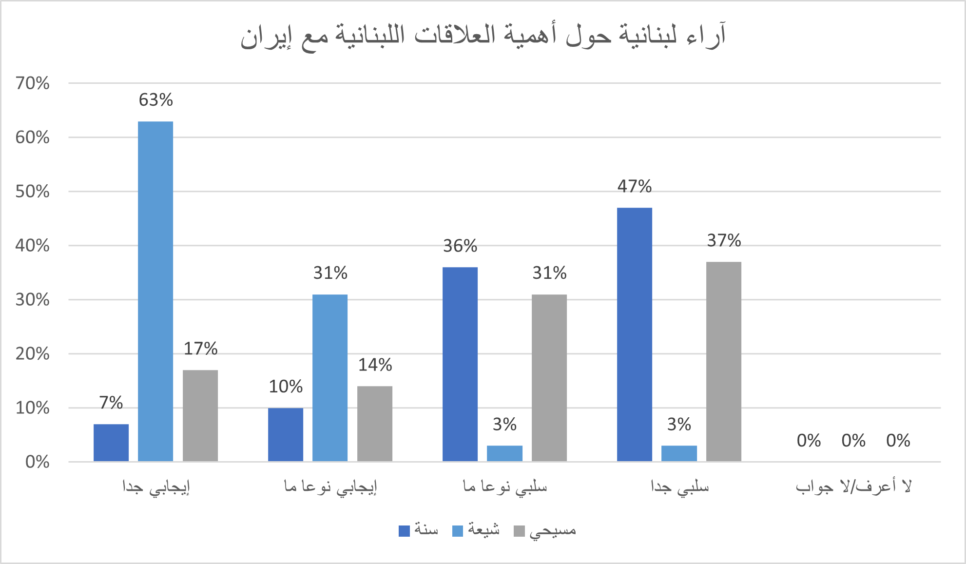الشعب اللبناني منقسم طائفيًا بشكل كبير في ما يتعلّق بالعلاقات مع قوى إقليمية بارزة على غرار إيران أو تركيا. فكل الشيعة تقريبًا (94 في المئة) يرون أنّه من المهم إقامة علاقات جيدة مع إيران ذات القيادة الشيعية. في المقابل لا يوافقهم الرأي سوى ثلث المسيحيين فقط و17 في المائة ليس أكثر من السنّة.