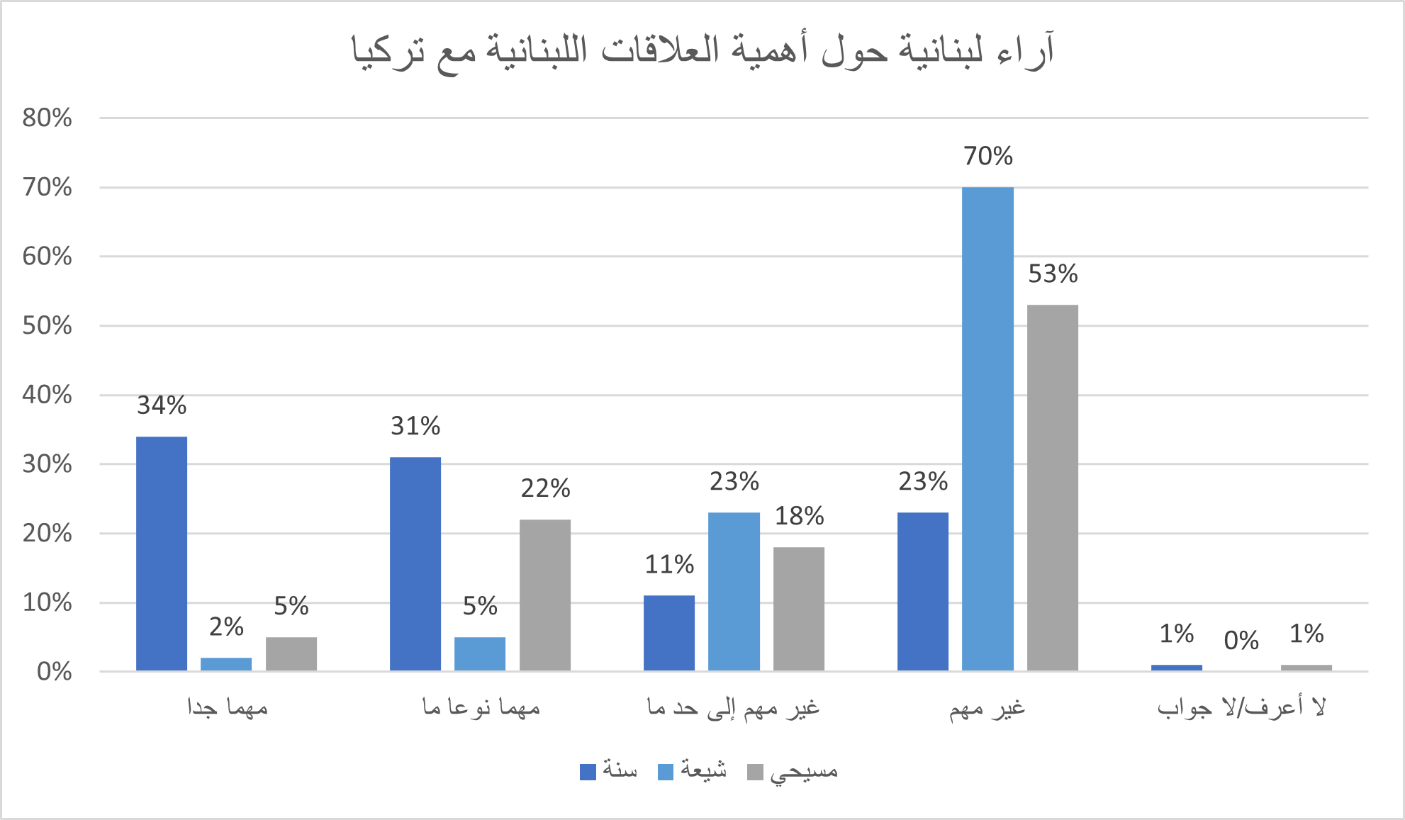 أما بالنسبة لتركيا، وهي بلد ذو أغلبية سنّية، فالصورة معكوسة تقريبًا: 65 في المئة من سنّة لبنان يعتبرون أنّ العلاقات الجيدة مع أنقرة مهمة مقابل 27 في المئة من المسيحيين و7 في المئة فقط من الشيعة الذين يتشاطرون وجهة النظر هذه. وكما هي الحال في أجزاء أخرى من المنطقة، أصبحت تركيا مؤخرًا ناشطة على نحوٍ متزايد في لبنان، ولا سيما في الشمال، وهو الجزء ذو الأغلبية السنّية في البلاد، وكذلك في العاصمة بيروت المختلطة بشكل كبير.