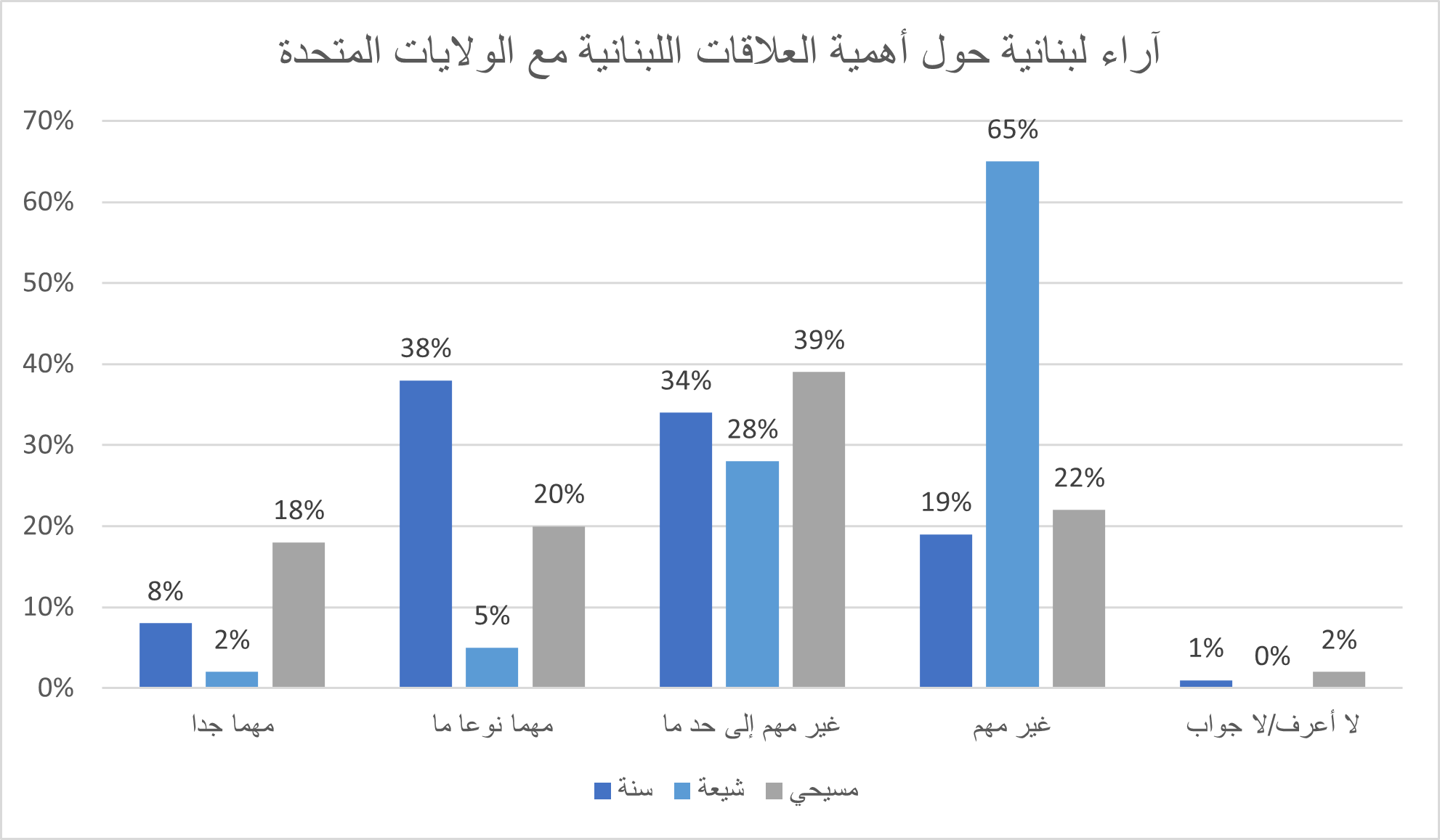 في المقابل، أتت النسب بشأن الولايات المتحدة أكثر انخفاضًا على نحوٍ ملحوظ، وبخاصةٍ في أوساط الشيعة. فنسبة 7 في المئة فقط من هذه المجموعة ترى أنّ العلاقات اللبنانية – الأميركية الجيّدة مهمة. والمفاجئ أيضًا أنّ هذه النسبة لا تتعدّى 38 في المئة في أوساط المسيحيين. أما النسبة الأعلى اليوم ضمن هذه الفئة فيسجّلها السنّة، حيث النصف تقريبًا (46 في المئة) يعتبرون أنّه من المهم الحفاظ على علاقات جيدة مع الولايات المتحدة.