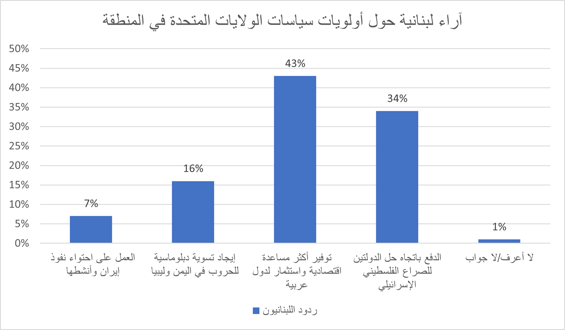 وعمومًا، وفي ما يخصّ سياسة الولايات المتحدة في الشرق الأوسط، ثمّة إجماع أكبر بكثير في أوساط هذه الجماعات الثلاث اليوم. فالأكثرية الشاملة (43 في المئة) تختار “توفير المزيد من المساعدات الاقتصادية والاستثمارات” بوصفه أبرز المقترحات على واشنطن. ويأتي في المركز الثاني (34 في المئة) “الدفع نحو إيجاد حلّ للصراع الفلسطيني – الإسرائيلي”. أما المسائل الأخرى، على غرار إيران أو اليمن أو ليبيا، فتحتلّ مراتب متأخرة للغاية.