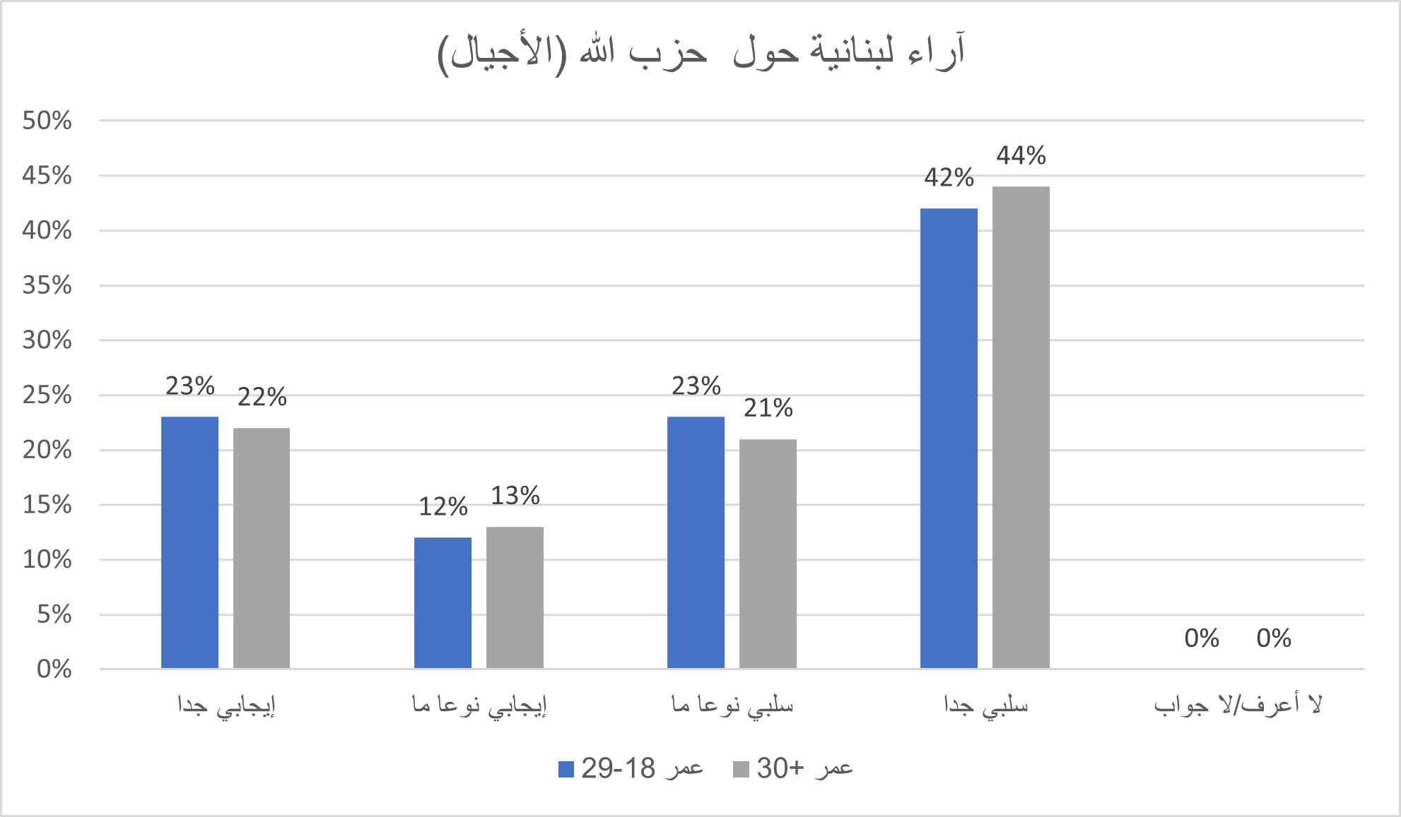 على نحوٍ مفاجئ، تُظهر نتائج هذا الاستطلاع اختلافات محدودة للغاية فقط، إن وجدت، بين المواطنين اللبنانيين، سواء الذين هم دون 30 سنة أو ما فوق. على سبيل المثال، ومن أصل إجمالي السكان، فإن نسبة الذين يعربون عن رأي إيجابي للغاية بشأن “حزب الله” من الفئتين العمريتين هي نفسها تمامًا: 35 في المئة.