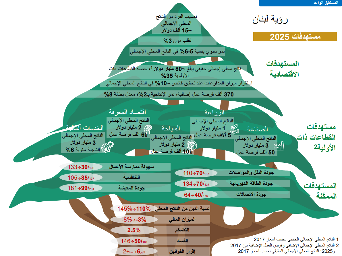 حدّدت هدفاً أساسياً يتمثّل بتحقيق نموّ يراوح بين 5% و6% سنويّاً، ليصل حجم الاقتصاد إلى 80 مليار دولار (ما حدث بالفعل أنّ الاقتصاد تقلّص إلى ربع هذا الرقم). وأوصت بالتركيز على خمسة قطاعات رئيسية، هي الزراعة والصناعة والسياحة والخدمات المالية واقتصاد المعرفة، بالإضافة إلى المورد الأساسي المتمثّل بأموال المغتربين.