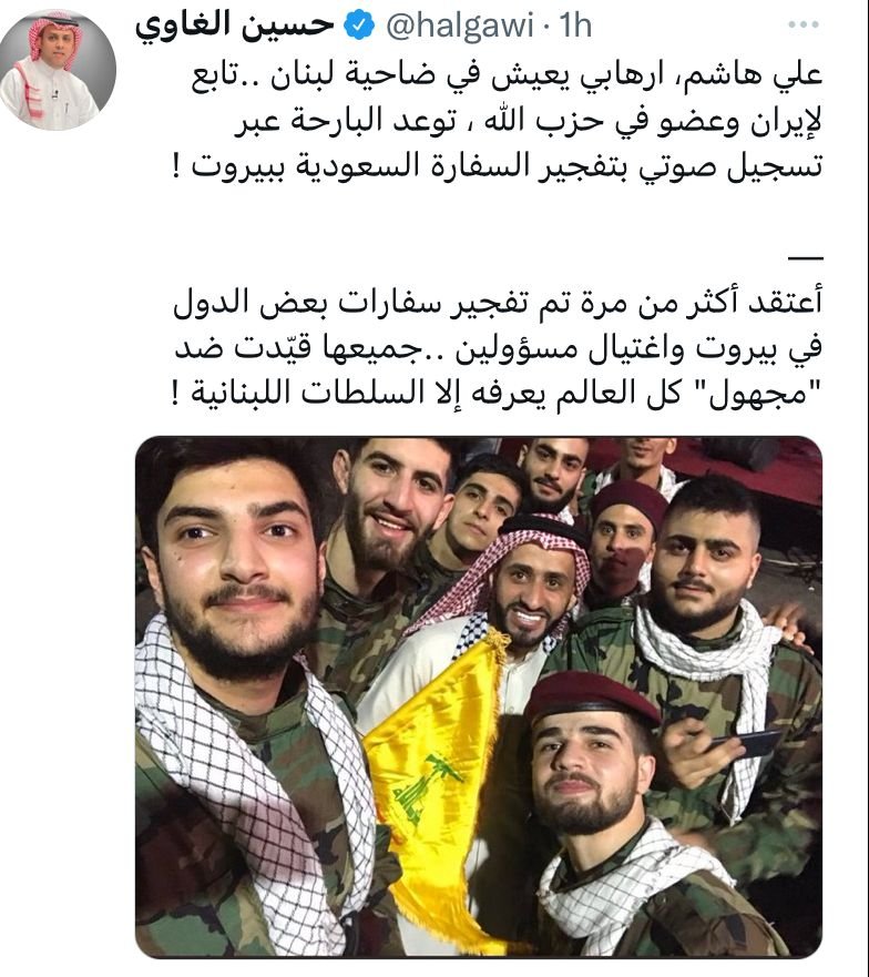 تسجيل علي هاشم الذي يهدّد فيه السفارة السعودية في بيروت وسفيرها، هو إخبار برسم حكومة تصريف الأعمال، رئيساً ووزيراً للداخلية ووزيراً للدفاع، ومعهم كلّ الأجهزة الأمنيّة التي تتبع لهم مباشرة أو بالوصاية عليها