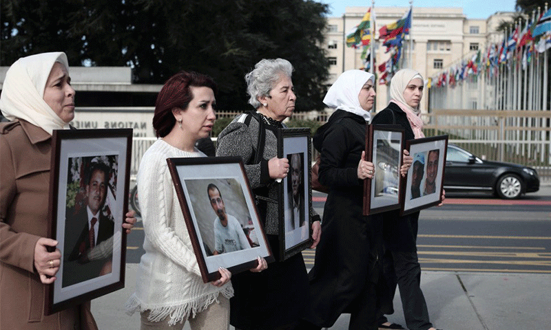 حديث الصورة: سيّدات سوريّات أمام مقرّ الأمم المتحدة في جنيف يحملن صور أقاربهنّ المعتقلين في سوريا (رابطة “عائلات من أجل الحريّة”).