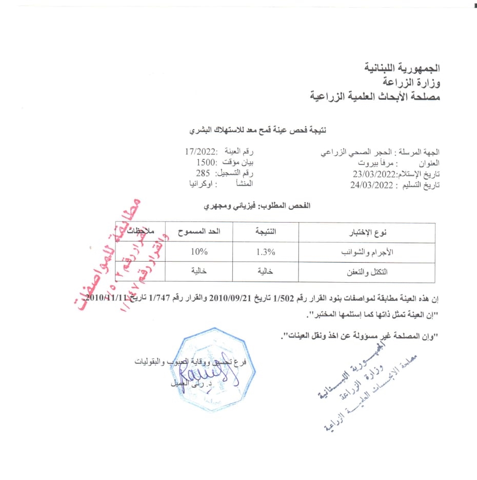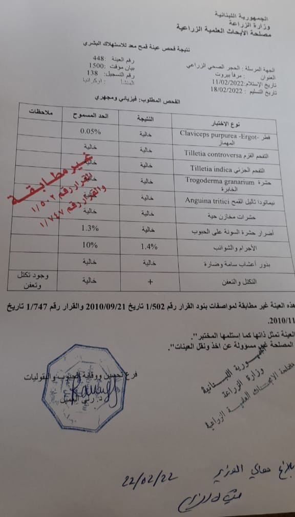 “غير مطابقة للمواصفات”، هكذا أتت نتيجة فحص عيّنة قمح معدّة للاستهلاك البشري أجرته مختبرات مصلحة الأبحاث العلمية في وزارة الزراعة. هذه النتيجة التي أثبتت وجود تكتّل وتعفّن في الشحنة المستوردة من أوكرانيا لمصلحة “شركة التاج اللبنانية”، هي لفحص أُجرِي في 7 آذار الماضي. ولم تكن الوحيدة التي أكّدت أنّ القمح غير صالح للاستعمال البشري. إذ سُحبت عيّنة ثانية وأرسلت من جديد إلى مصلحة البحوث العلمية الزراعية، التي عادت وأكّدت في 18 آذار ما تأكّد في الفحص الأوّل، وهو أنّ الشحنة غير مطابقة لمواصفات القرار رقم 502/1 وتفصيلاته في القرار رقم 747/1. وهما قراران صدرا عام 2010 ويتعلّقان بإخضاع القمح المستورَد المعدّ للاستهلاك البشري للفحوص المخبرية.