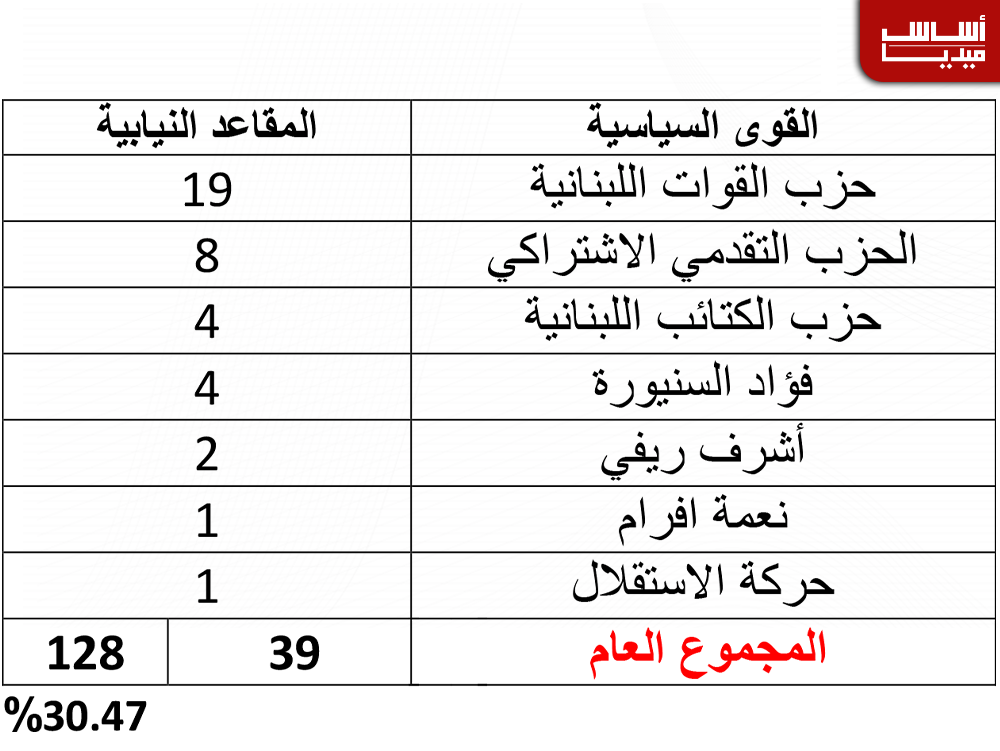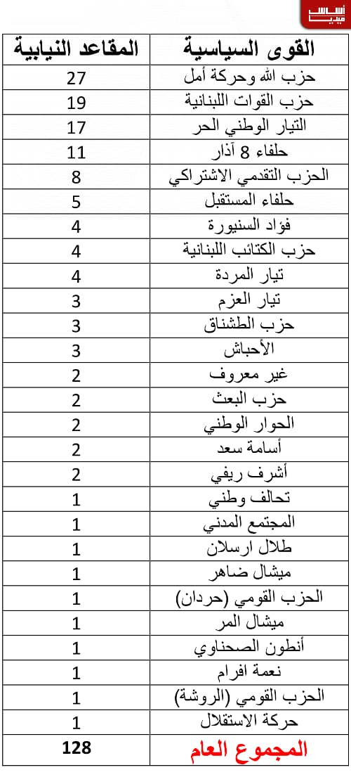 ينشر موقع “أساس” النتائج النهائية الافتراضية للانتخابات النيابية، وأحجام الكتل النيابية والقوى السياسية التي سيتشكّل منها مجلس النواب الجديد، والتي تؤكّد أنّ حزب الله وحلفاءه سيحصلون على 70 نائباً، مقابل 39 للقوات اللبنانية وحلفائها الإفتراضيين، و19 نائباً للمستقلّين.