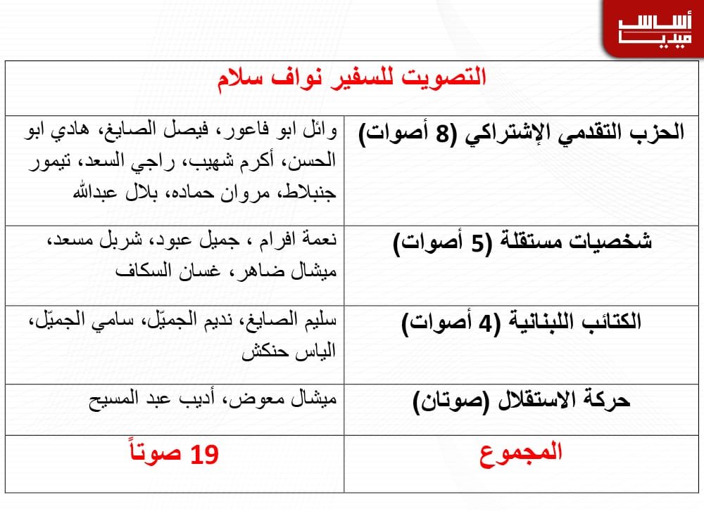في حين أنّ الحزب التقدمي الإشتراكي قد يبقى وحيداً مع حزب الكتائب وبعض النواب المستقلّين وحركة الاستقلال، بما لا يزيد عن 21 صوتاً لسلام.