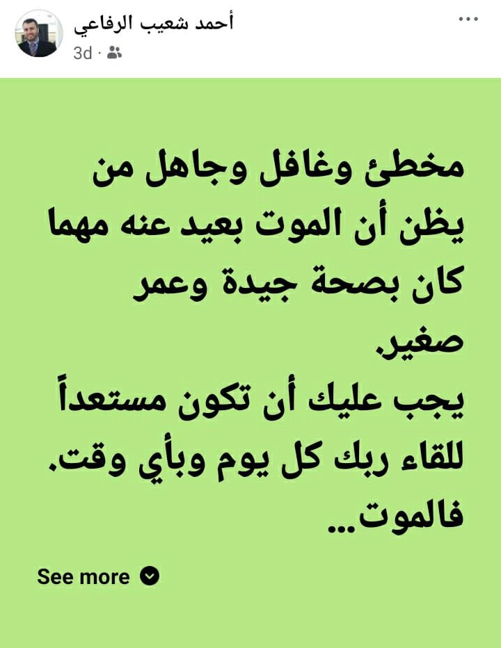وكتب في آخر: “مخطئٌ وغافلٌ وجاهلٌ من يظنّ أنّ الموت بعيد عنه مهما كان بصحة جيدة وعمر صغير. يجب عليك أن تكون مستعدّاً للقاء ربّك كلّ يوم وبأيّ وقت فالموت بين ضلوعك”.