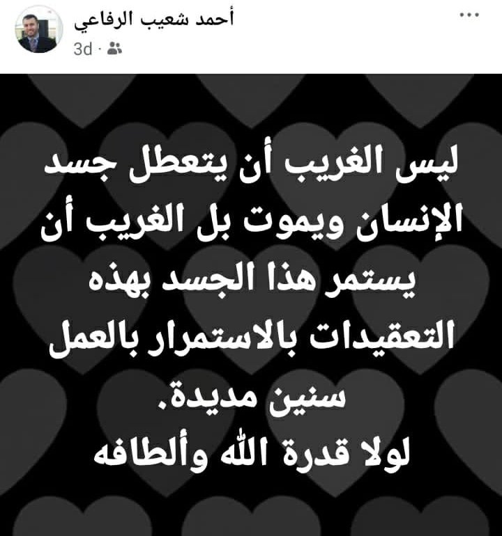أمّا في تعليق ثالث فكتب: “ليس الغريب أن يتعطّل جسد الإنسان ويموت بل الغريب أن يستمرّ هذا الجسد بهذه التعقيدات بالاستمرار بالعمل سنين مديدة لولا قدرة الله وألطافه”.